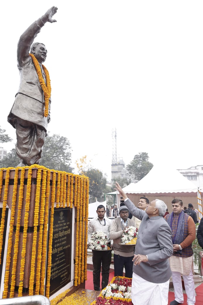 पटना, बीपी डेस्क : पूर्व प्रधानमंत्री भारत रत्न स्व० अटल बिहारी वाजपेयी जी की जयंती आज पूरे देश में मनायी गयी। स्व० अटल बिहारी वाजपेयी जी के जन्मदिवस पर राजकीय जयंती समारोह का आयोजन पाटलिपुत्रा पार्क, पटना में किया गया। मुख्यमंत्री श्री नीतीश कुमार ने स्व० अटल बिहारी वाजपेयी जी की प्रतिमा पर माल्यार्पण कर उन्हें भावभीनी श्रद्धांजलि अर्पित की।