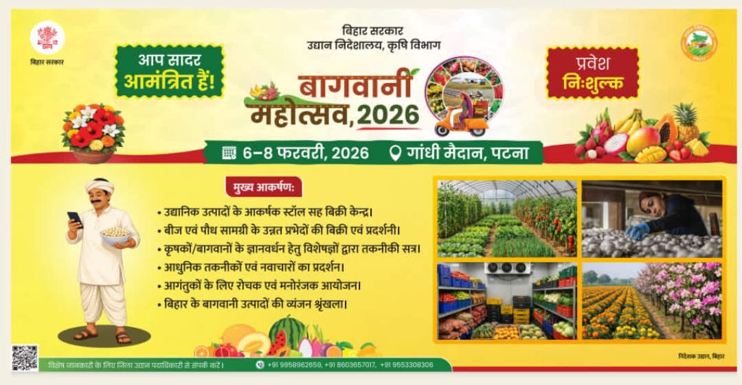 किसानों, उद्यमियों और युवाओं को बागवानी से जुड़ी नवीनतम तकनीकों, उन्नत पौध सामग्री तथा फल एवं सब्ज़ी उत्पादन, प्रसंस्करण, संरक्षण और विपणन की आधुनिक प्रणालियों से अवगत कराने के उद्देश्य से पटना के गांधी मैदान में दिनांक 6 से 8 फरवरी तक भव्य बागवानी महोत्सव का आयोजन किया जा रहा है। यह महोत्सव बागवानी क्षेत्र में ज्ञान, नवाचार और अवसरों को सुदृढ़ करने का एक प्रभावी मंच सिद्ध होगा।