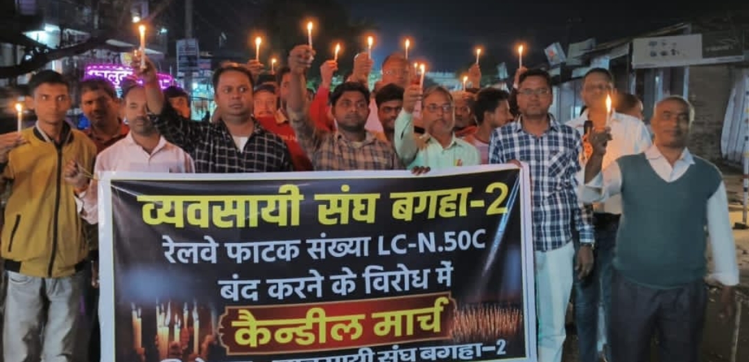 बेतिया, राजन द्विवेदी। गोरखपुर रेल मंडल के द्वारा पश्चिम चंपारण जिले में गोरखपुर-नरकटियागंज रेल खंड पर स्थित बगहा-2 में रेलवे फाटक बंद करने के विरोध में स्थानीय व्यवसायी और नागरिकों ने शांतिपूर्ण कैंडल मार्च निकाला।