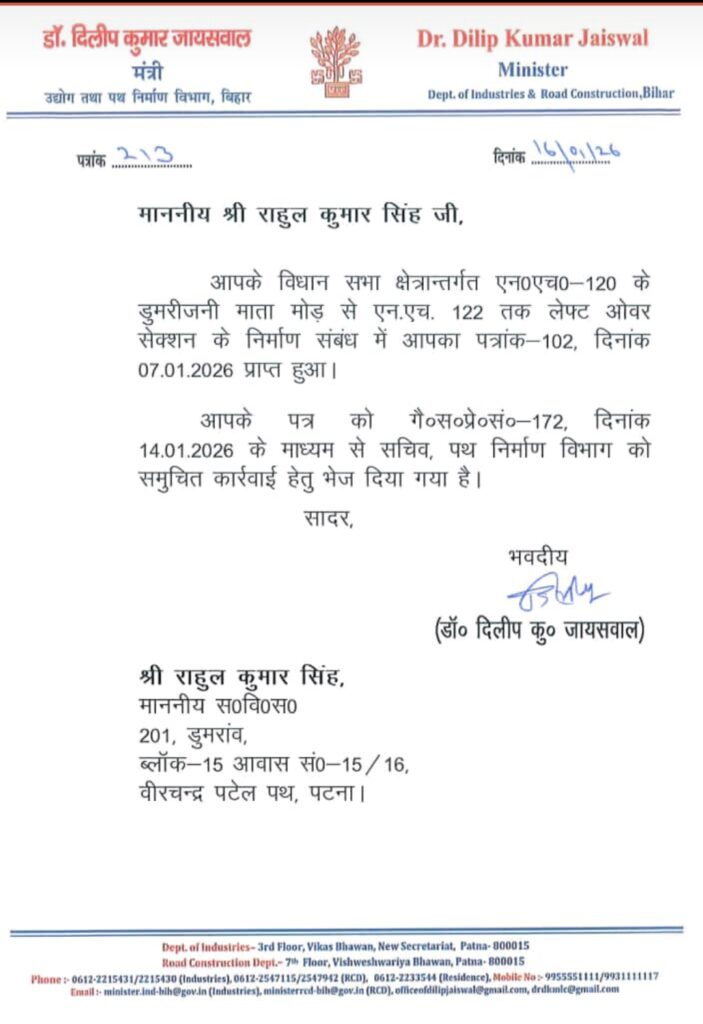 मंत्री डॉ. दिलीप कुमार जायसवाल ने विधायक के अनुरोध पर सकारात्मक रुख अपनाते हुए शुक्रवार को एक अधिसूचना जारी की। पत्रांक 213, दिनांक 16 जनवरी 2026 के तहत जारी पत्र में मंत्री ने बताया कि एनएच-120 के डुमरेजनी माता मोड़ से एनएच-122 तक लेफ्ट ओवर सेक्शन के निर्माण संबंधी पत्र को पथ निर्माण विभाग के सचिव को समुचित कार्रवाई हेतु भेज दिया गया है।