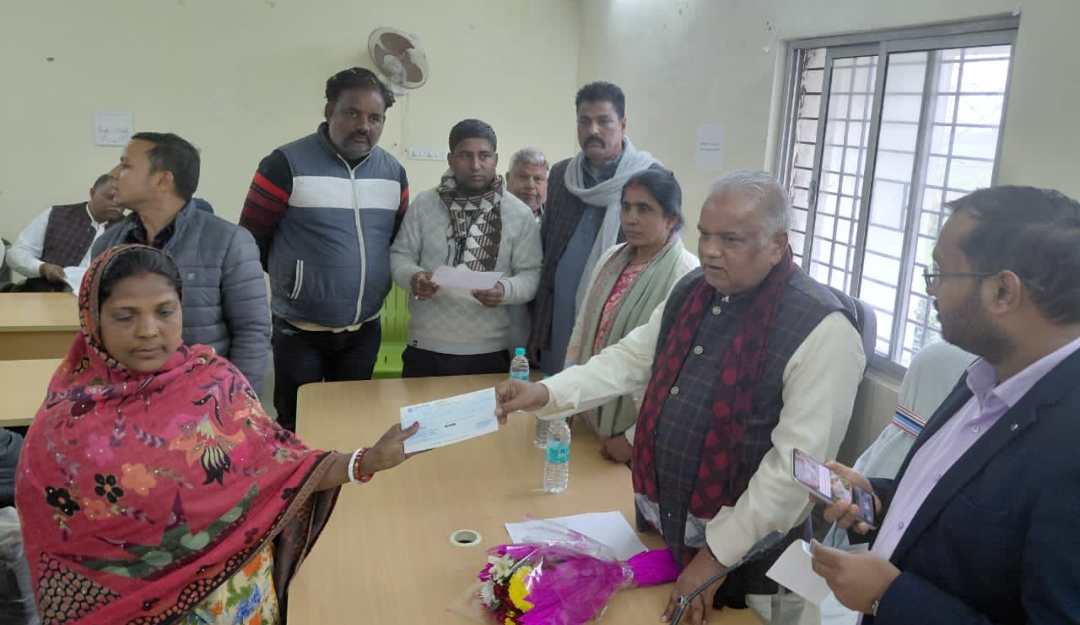 बडी आट निवासी मृतक आरती कुमारी के पति ओमप्रकाश रविदास शहरी गांव निवासी मृतक सुरेश पंडित की आश्रित पत्नी सामपति देवी लेलिन नगर गांव के मृतक नौलख मांझी की आश्रित पत्नी गीता देवी को चार लाख अग्निकांड पीड़ित शर्विला देवी सोनी देवी एवं विजेन्द्र प्र को राज्य सरकार के द्वारा प्रदत्त 11 हजार की सहायता राशि का चेक प्रदान किया गया।