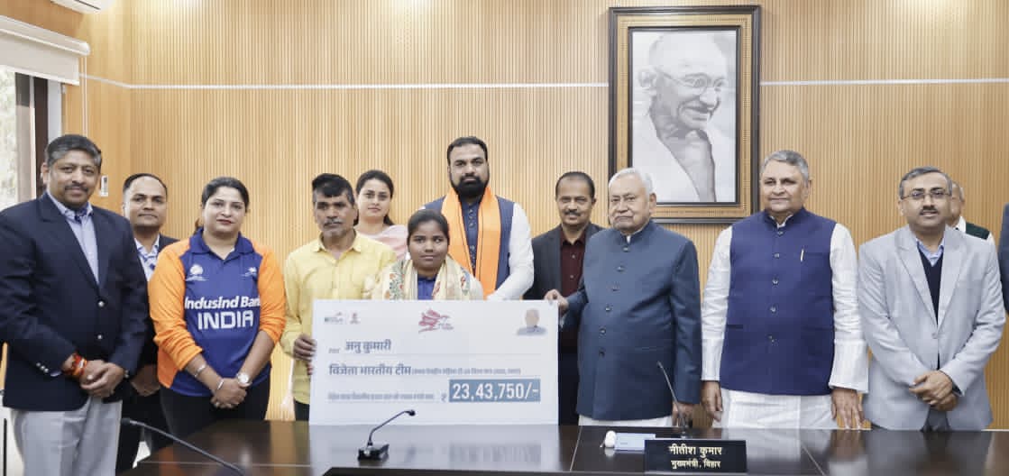 बीपी डेस्क। मुख्यमंत्री श्री नीतीश कुमार ने आज 01 अणे मार्ग स्थित ‘संकल्प’ सभागार में प्रथम नेत्रहीन महिला टी-20 विश्व कप-2025 की विजेता भारतीय टीम की खिलाड़ी सुश्री अनु कुमारी को 23 लाख 43 हजार 750 रूपये का चेक एवं अंगवस्त्र प्रदान कर उन्हें सम्मानित किया। सुश्री अनु कुमारी प्रथम नेत्रहीन महिला टी-20 विश्व कप-2025 की विजेता भारतीय टीम की सदस्य रही है। भारतीय टीम को विजय बनाने में उन्होंने महत्वपूर्ण भूमिका अदा की है।