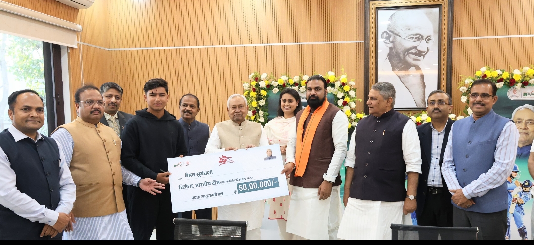 बीपी डेस्क। मुख्यमंत्री श्री नीतीश कुमार ने आज 1 अणे मार्ग के ‘संकल्प सभागार’ में अंडर-19 क्रिकेट वर्ल्ड कप-2026 की विजेता भारतीय टीम में उत्कृष्ट प्रदर्शन कर बिहार को गौरवान्वित करने वाले श्री वैभव सूर्यवंशी को 50 लाख रूपये का चेक एवं अंगवस्त्र प्रदान कर सम्मानित किया।